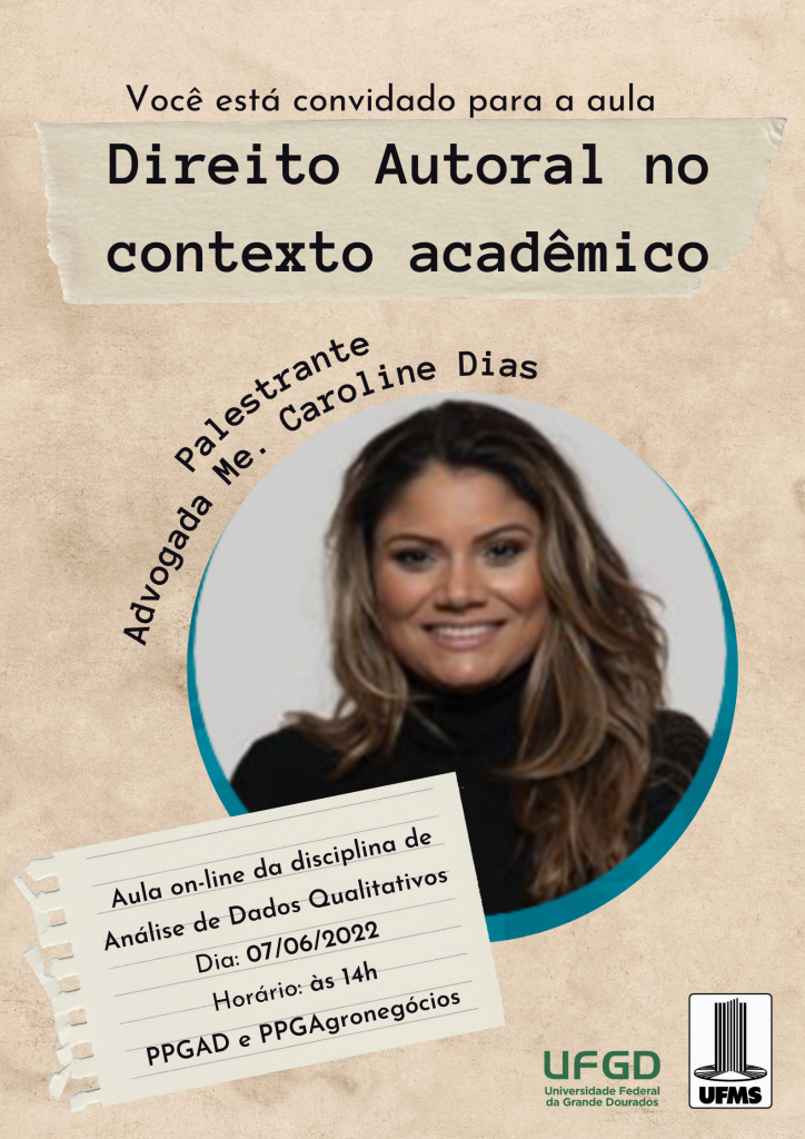 Ciente da importância do tema, será realizada no dia 7 de junho, terça-feira, às 14h (local), a aula on-line “Direito Autoral no contexto acadêmico”, com a advogada Caroline Mendes Dias. O evento faz parte da programação da disciplina Análise de Dados Qualitativos, ministrada pela professora doutora Erlaine Binotto, tanto no Programa de Administração da UFMS como no Programa de Agronegócios da UFGD.